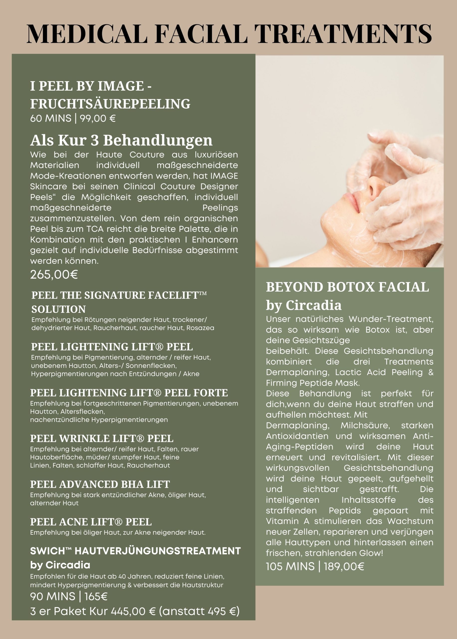 Tre Beauty & Spa bietet hochwirksame medizinische Gesichtsbehandlungen, darunter Fruchtsäurepeelings von IMAGE Skincare, die individuell auf verschiedene Hautprobleme wie Rötungen, Pigmentflecken, Falten und Akne abgestimmt sind. Das SWICH Hautverjüngungstreatment eignet sich besonders für reife Haut ab 40 Jahren, während das Beyond Botox Facial eine natürliche Alternative zu Botox darstellt. Es kombiniert Dermaplaning, Milchsäurepeeling und Peptid-Masken, um die Haut sichtbar zu straffen, zu revitalisieren und ihr einen jugendlichen Glow zu verleihen.