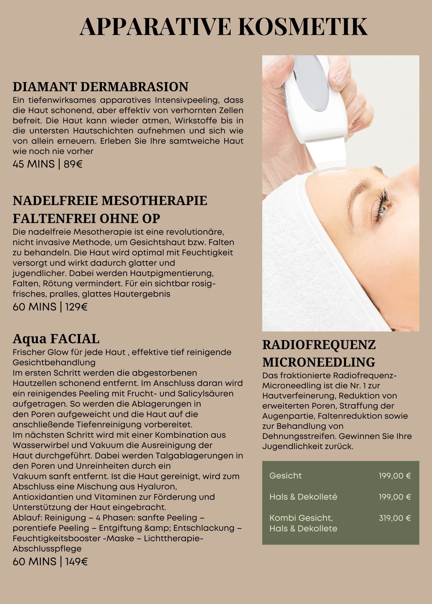 Wir bieten fortschrittliche Hautbehandlungen, die tiefere Hautprobleme und Alterungsprozesse adressieren, die mit traditionellen Methoden nicht erreicht werden können. Diamant Dermabrasion: Tiefenpeeling, entfernt abgestorbene Hautzellen und fördert die Hauterneuerung. Nadelfreie Mesotherapie: Spendet Feuchtigkeit, reduziert Falten und sorgt für ein strahlendes Hautbild. Aqua Facial: Tiefenreinigung und Versorgung der Haut mit Nährstoffen für frische, gesunde Haut. Radiofrequenz Microneedling: Verfeinert die Poren, reduziert Falten und strafft die Haut.