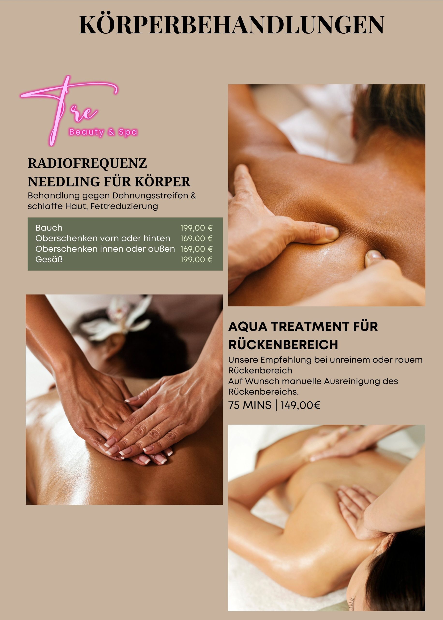Unsere Körperbehandlungen beinhalten Radiofrequenz Needling zur Bekämpfung von Dehnungsstreifen, schlaffer Haut und zur Fettreduzierung an Bereichen wie Bauch, Oberschenkeln und Gesäß. Zusätzlich bieten wir das Aqua Treatment für den Rücken an, ideal bei unreiner oder rauer Haut, mit der Möglichkeit einer manuellen Ausreinigung auf Wunsch.