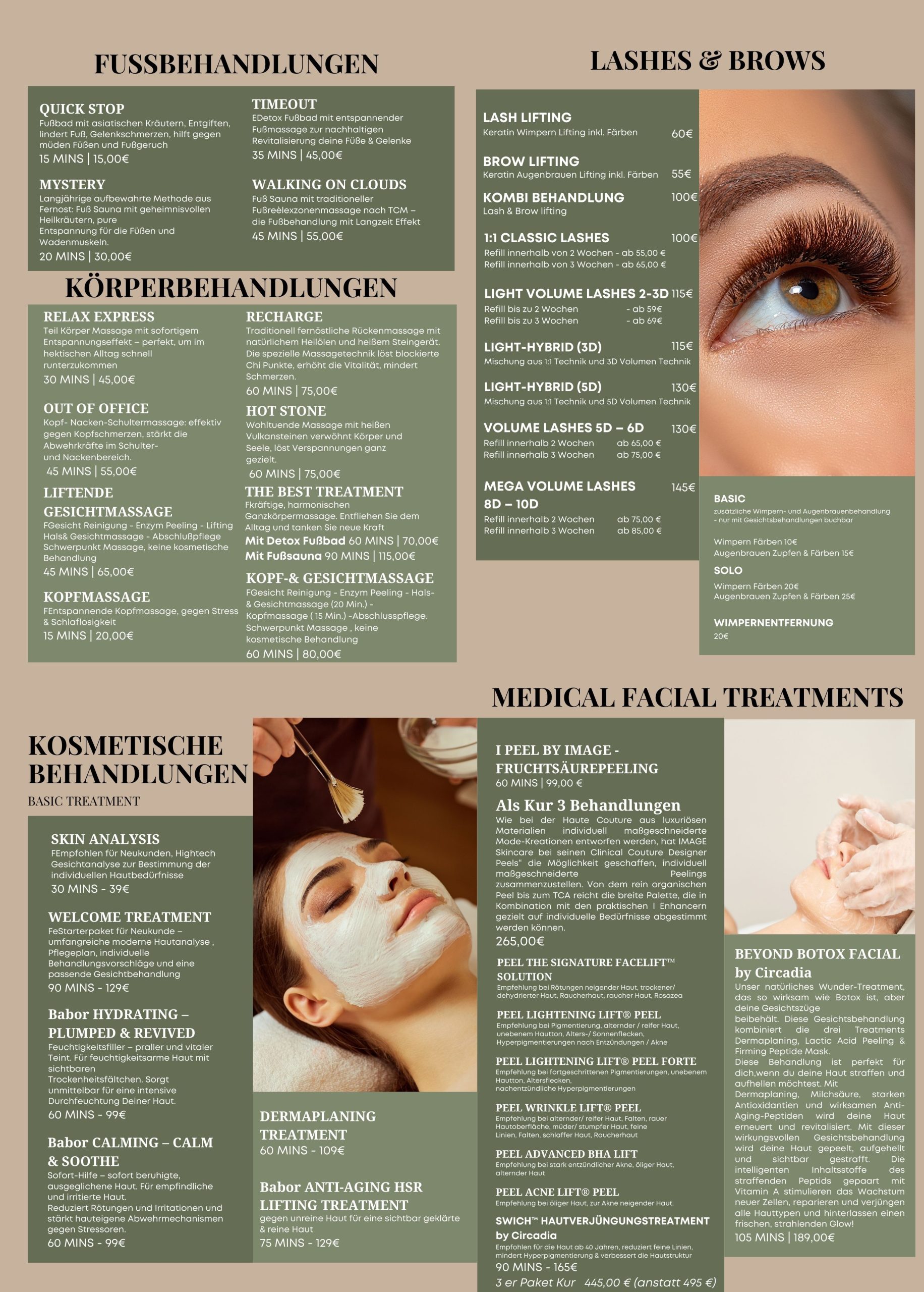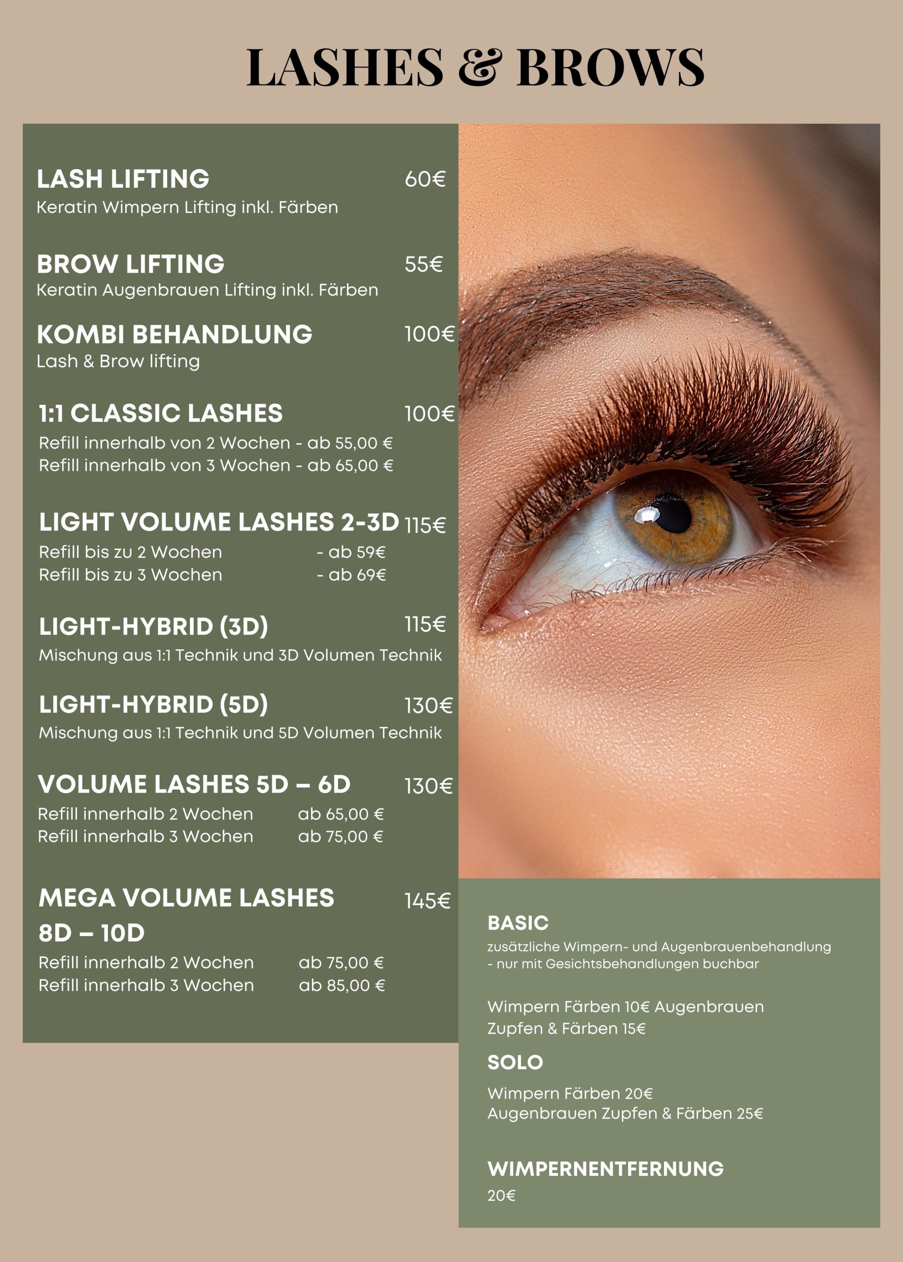 Tre Beauty & Spa bietet eine Vielzahl an Wimpern- und Augenbrauenbehandlungen, darunter Wimpern- und Brauenfärbung, Keratin Lash & Brow Lifting sowie professionelle Wimpernverlängerungen mit UV-Kleber. Die Wimpernverlängerung gibt es in verschiedenen Techniken wie 1:1 Classic, Light Volume (2-3D), Hybrid, Volume (5-6D) und Mega Volume (8-10D), jeweils mit Auffülloptionen. Zudem wird eine schonende Entfernung von Wimpernverlängerungen angeboten.