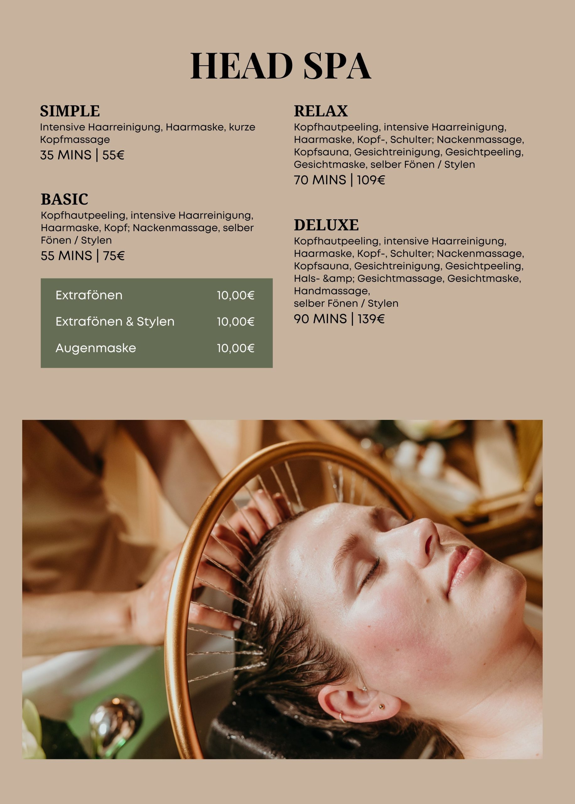 Das Head Spa ist eine luxuriöse Behandlung aus Japan, die Haarpflege, Massage und Aromatherapie kombiniert. Es fördert die Kopfhautgesundheit, kann Haarausfall reduzieren, entspannt die Muskeln, lindert Kopfschmerzen und sorgt für gepflegtes, glänzendes Haar. Zudem bietet es tiefen Stressabbau.